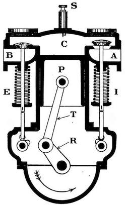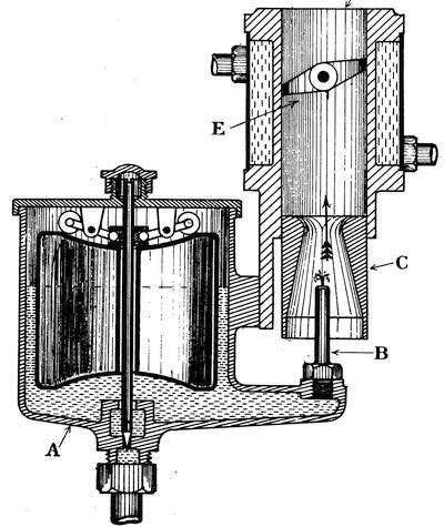 Paraffin is obtained during the distillation of petrol from crude petroleum, and consists of carbon (C) and hydrogen (H) in almost the same proportions as petrol. Its110 volatility is low, and it requires heat to vaporize it. The heat required for vaporization is usually obtained from the exhaust gases after the engine has been got running. In starting up a lamp must be used for heating the vaporizer of the carburettor. Paraffin will stand a little higher compression than petrol before pre-igniting. The specific gravity of paraffin may be taken as 0·80 and its calorific value as 18,000 B. Th. U. per lb. It is much cheaper than either petrol or benzol, being only about one-third of the cost. The chief objections to its use are its smell and the greasy character of the stain left by it on coachwork or clothes; also the difficulty of having to heat the vaporizing chamber of the carburettor. It is much safer to handle and store than either petrol or benzol, and requires about the same proportion of air to form an explosive mixture as that given for petrol. The range of variation of strength in the mixture which is permissible with paraffin is much less than with either petrol, benzol, or alcohol. Alcohol has the greatest range of variation in mixture strength. Paraffin is also very liable to deposit carbon, owing to the small range of variation permissible in the strength of the mixture.