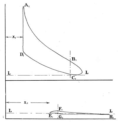 The average or mean height of the diagram also gives what we term the mean effective pressure acting on the piston, and constitutes the Pe of the indicated horse-power formula above. The area ABCD is always small and generally neglected with four-stroke engines. There are two separate diagrams for a two-stroke engine. The diagram for the working cylinder is A1B1C1D1 in Fig. 70, and that for the crankchamber is E1F1G1H1. The effective work done per cycle is measured by the difference in the area of these two diagrams. The piston uncovers the exhaust port at B1 and closes it again at C1; it uncovers the inlet port at F1 and covers it again at G1. From F1 to G1 the charge is being delivered from the crankchamber to the working cylinder. The area of the loop E1F1G1H1 is larger than the corresponding portion of the four-stroke diagram and should not be neglected.
