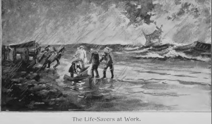 A few minutes passed, during which some of the crew had a chance to warm their numb fingers at the fire. The direction of the wind was favorable, and the keeper had strong hopes of getting that first line over the vessel. But there was no pull upon it—nothing to show that those on the wreck had seen it. And yet it had certainly fallen on the brig, for all attempts by those on shore to withdraw it were futile. Perhaps the unfortunate crew knew the line was on deck, but were unable to reach it without being washed away; perhaps they were too thoroughly chilled to make any exertion in their own behalf, although this seemed scarcely possible in view of the short time the vessel had been aground. But at any rate they failed to p. 16secure the line, and in trying to haul it back on shore it parted somewhere off in the darkness.