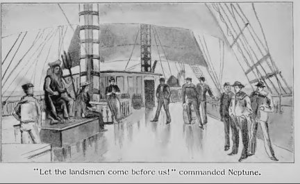 She had the usual nondescript crew found on deep-water ships, and after hearing some of them talk, one might well agree with Mr. Marsh “That the captain or mate who goes to sea now-a-days, should understand Chinese, Greek, Hindostanee, Russian-Finn, and a dozen other tongues, besides having the patience of Job.” It being Sunday, no one was required to do any work but what was necessary in navigating the ship, and the men improved their leisure time in various ways. A few spruced up a bit; among them, Gene, the Frenchman, who was far above the rest in intelligence and ability. After arraying himself in a scarlet woolen shirt, new trousers and shoes, he lay down in his p. 269bunk to read, unmindful of the turmoil about him. Several produced sewing materials and mended their clothes, keeping time with their feet while an agile young fellow danced; others sang coarse songs, or told stories. Jack, a tow-headed Scandinavian, devoured “Demon Dick, the Dare-devil.” He had purchased a number of these hair-raising effusions, and read them in preference to the tracts and pious books furnished by the Sailors’ Aid Society, only one of which had been opened, and that was being used up for cigarette papers. Some played gambling games, using plugs of tobacco for stakes, while Jumbo, the smallest man on board (formerly a trapeze performer), gave an exhibition on a tight rope which won applause. One group discussed the subject of provisions, and though all agreed that the “grub” on the Sagamore was satisfactory, some found great fault with the cookery. Then they abused the mates, decided that Captain Meade was afraid to carry sail enough, and speculated as to how much Hartley and Wilbur were worth—for whenever there are passengers on merchant ships the crew seem to consider them millionaires.