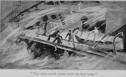 What followed baffles description. Those who had hold of the starboard brace escaped by clinging tightly to it and ducking beneath the bulwarks, where they were buried under several feet of water, but the others fared worse, being exposed to the full force of the sea. Whether Norris, Smith, and Harry grasped the life-lines or not, they never could clearly tell, but when the ship rolled to port, the great sea swept them before it like flies. p. 287All three, by a providential circumstance, were knocked down and jammed in between the iron stanchions and a spare spar lashed to the bulwarks,—all that saved them from going overboard.