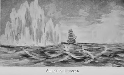 Just before daybreak, the thrilling cry of “Ice dead ahead!” came from the lookout, and there was hardly time to give the wheel a few turns before a great gray mass loomed up on the port bow. A moment more, and one of the gigantic ice mountains so dreaded in these southern seas came into plain view. It towered far above the mast-heads, culminating in a circle of fantastic pinnacles which resembled the turrets of a castle. The waves, breaking against its base with a noise like thunder, hurled themselves far up its steep sides, soon to descend in the form of foaming cataracts and water falls. High up on the near side, overhanging the water, was a threatening mass of ice that seemed ready to fall on the ship, and blot her out of existence. So perilously close to the great berg was the Sagamore, that its freezing breath chilled all on deck to the marrow, and the ship’s red port light, as she swept by, shone weirdly on the frozen mass, revealing gruesome caverns that penetrated far inward. Everyone breathed p. 261easier when the monster was passed, and several recalled the names of missing ships that mysteriously disappeared in the South Atlantic.