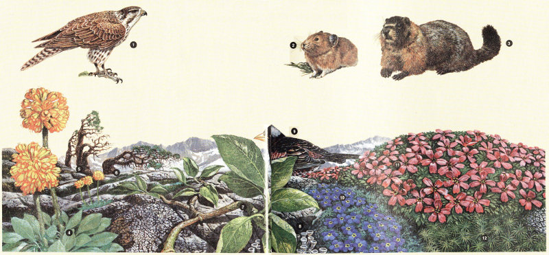 Specialized and severe, the alpine world is sparsely populated. Here eagles and weasels hunt for bird nestlings, marmots, pikas, pocket gophers, deer mice, and voles. The heartbeat of the extremely fragile tundra is slow by necessity. That any plants have adapted to this environment seems incredible. Yet alpine laurel fills rock crevices. Spring beauty blooms in pockets of soil. Mats of moss campion carpet slopes of shattered rock. White columbine nod in the wind shadows of larger rocks. Alpine sunflowers blaze like a galaxy of equal suns, their disproportionately large flowers awkwardly seated on abbreviated stalks.