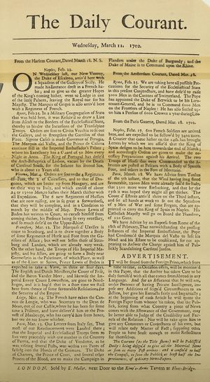This Courant (as the Title shews) will be Publish'd Daily; being design'd to give all the Material News as soon as every Post arrives: and is confin'd to half the Compass, to save the Publick at least half the Impertinences, of ordinary News-Papers.