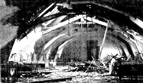 A l'église Saint-Jean-Baptiste, le doyen me fait visiter les dégâts: les obus ont plu ici comme ailleurs. Les voûtes sont percées à jour, les vitraux n'existent plus, la toiture est pulvérisée; cela n'empêche pas de songer à demain et une petite équipe d'ouvriers nettoie la nef.