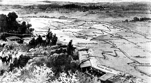 Quant aux tranchées fortifiées, nos dessins en montrent nettement la conception et le dispositif. Elles sont à l'abri des balles et des shrapnells. Seuls les obus percutants ont le pouvoir de les pulvériser et de décimer leurs défenseurs. Les détails à l'intérieur varient à l'infini, suivant l'ingéniosité des occupants, la tranquillité relative dont ils jouissent et aussi la nature du sol.