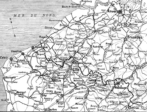 Le 20, les Allemands tenaient les avancés de Lille; le 21, nous approchions de la grande ville jusqu'à 6 kilomètres des remparts, à Radinghem; le 22, nouvelle avance; le 24, nos lignes vers Lille sont attaquées et l'ennemi est repoussé; depuis lors les attaques allemandes sont demeurées infructueuses.