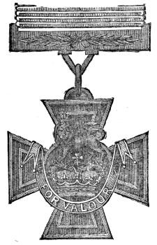 Somewhat reminiscent of a badge awarded to the 28th Regiment after the siege of Badajoz in the Peninsular War,—a badge which bore a crown, a star, and the letters V.S., signifying “Valiant Stormer,”—the Victoria Cross is adorned with a crown surmounted by a lion, and a scroll bearing the simple inscription “For Valour.” On the reverse side of the medal is given the date or dates of the act of bravery for which it has been awarded, while the name of the recipient is inscribed at the back of the bar to which it is attached by a V. The Cross, which is cast from cannon that were taken at Sebastopol, is suspended from its wearer’s left breast by a piece of ribbon, blue for the Navy and crimson for the Army.