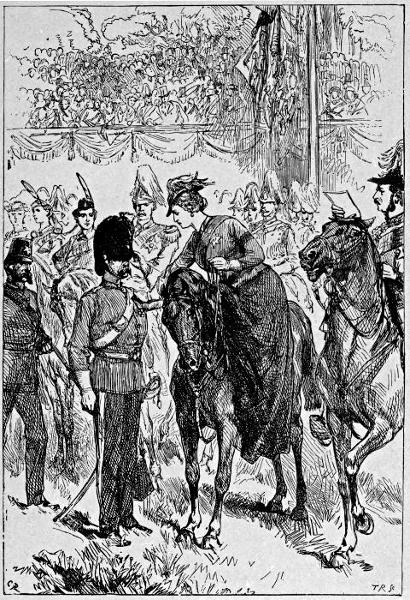 Just before ten o’clock, to the booming of a royal salute, her Majesty, with the Prince Consort, the Crown Prince of Prussia, the Prince of Wales and his brother Prince Alfred (the late Duke of Saxe-Coburg-Gotha), all on horseback, rode into the Park and took their places near the dais that had been prepared. On a small table near by, showing up strongly against the scarlet cloth with which it was covered, lay the Crosses that were to be bestowed that morning. The little band of sixty-two heroes, headed by Lieutenant Knox, of the Rifle Brigade, meanwhile stood at ease a little distance off, the observed of all observers, until the signal was given, and then one by one they came forward as Lord Panmure, the then Secretary for War, read out their names.
