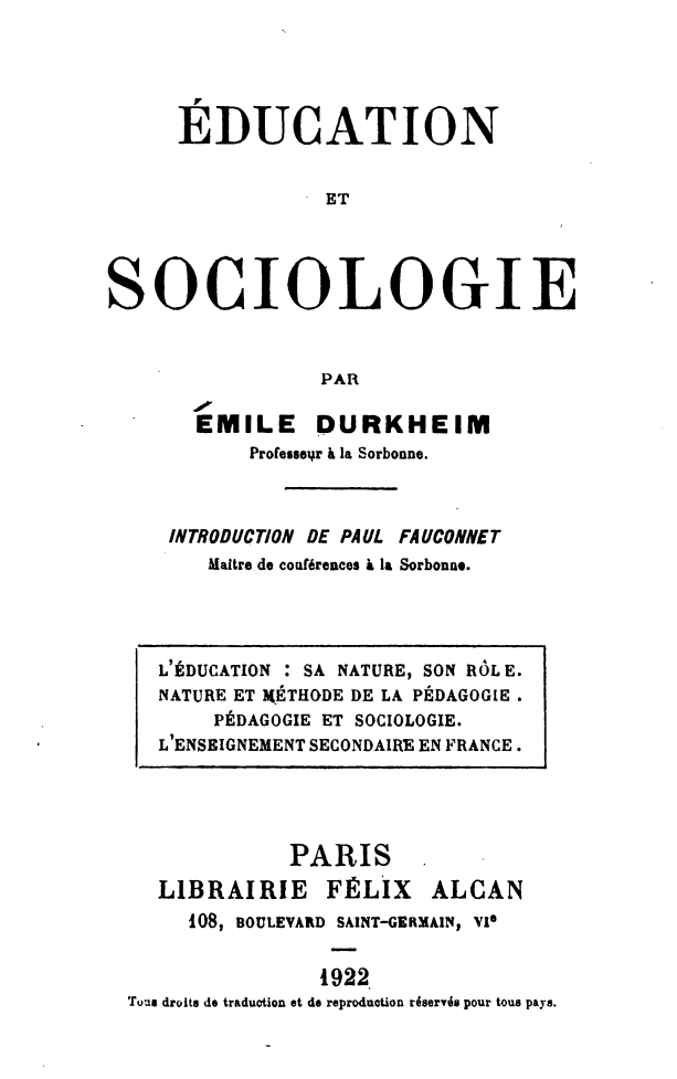 Durkheim a enseigné toute sa vie la pédagogie, en même temps que la sociologie. À la Faculté des lettres de Bordeaux, de 1887 à 1902, il a toujours donné, hebdomadairement, une heure de cours à la pédagogie. Ses auditeurs étaient surtout des membres de renseignement primaire. À la Sorbonne, c'est dans la chaire de Science de l'Éducation qu'en 1902 il suppléa, qu'en 1906 il remplaça M. Ferdinand Buisson. Jusqu'à sa mort, il y a réservé, à la pédagogie, un tiers au moins, et souvent les deux tiers de son enseignement: cours publics, conférences pour les membres de l'Enseignement primaire, cours aux élèves de l'École Normale Supérieure. Cette œuvre pédagogique est presque entièrement inédite. Nul de ses auditeurs, sans doute, ne l'a embrassée dans toute son étendue. Nous voudrions ici la présenter en raccourci.