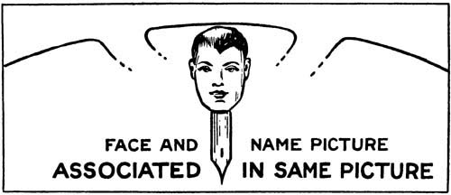 The problem of remembering names is the same as remembering anything else and can be solved by the use of the same general principles. Attention and concentration are necessary and produced by the visual picture. To recall this name at will you take advantage of the Law of Association, and hitch the Name Picture to the Face Picture. The face becomes[Pg 123] our Hitching Post and when you see it you see with it the mind's eye picture of the name.