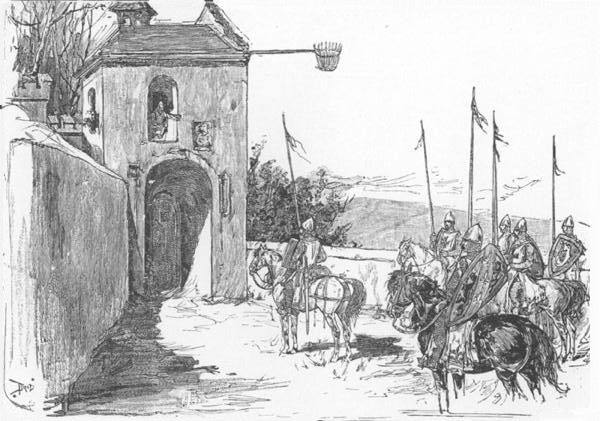 Arriving at the gate, the Count found there one sentry fast asleep. This fellow was quickly seized and bound, with a scarf over his mouth; and the gate being opened, the remainder of the Count's force, which had been ordered around to the front, was noiselessly admitted.