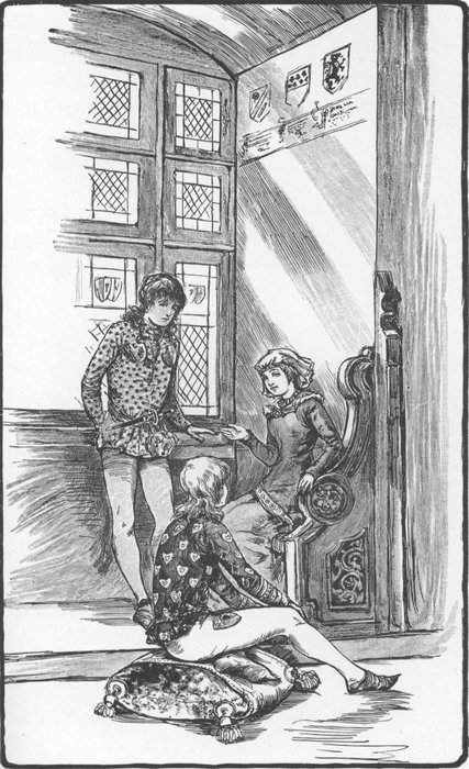 When the two brothers entered the chateau, they went directly to their mother's apartments. They found her in a large room, the floor of which was covered with soft rushes, for there were no carpets in those days. There was an abundance of furniture, but it was stiff and heavy, and on the walls there hung various pieces of tapestry, of silk or wool, most of which the good lady had embroidered herself.