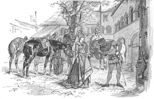Matters were in this condition when, one beautiful day in autumn, Count Hugo came again to Viteau. This time he did not clamber over the wall, but rode in bravely at the front gate. He was not followed by a body of steel-clad soldiers, but he brought his daughter Agnes, with her attendants, and a company of followers in gay and bright array. He did not come to conquer, but he came because he had been conquered. He came to ask the lovely Countess of Viteau to be his wife.