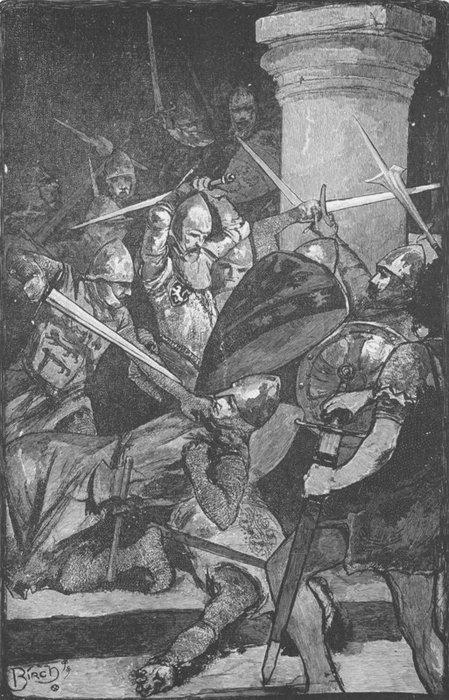 Meanwhile, the struggle raged fiercely below, the crowd of combatants surging from one side to the other of the court. It was not long, however, before the cotereaux began to be demoralized by the fierce and wild attacks of their mailed antagonists. Michol had been killed, and there was no one to command and rally them. Some of them, being hard pressed and finding the great gate open, rushed wildly through and were lost in the outer darkness; and before long the main body of the cotereaux, finding that many of their companions were retreating through the gate, were seized with a panic and a desire to fly while they had the opportunity.