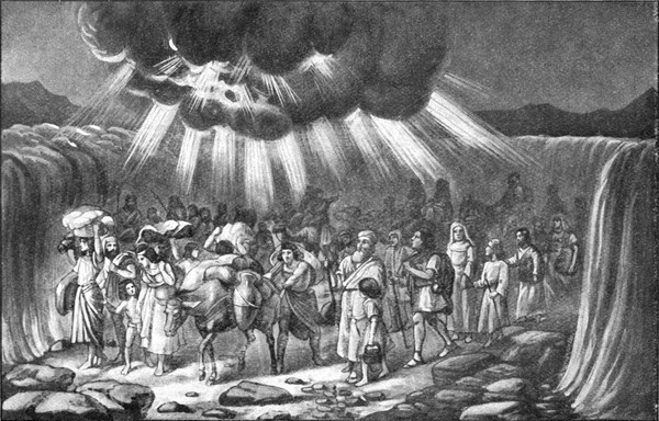 Ein weiteres Vorbild der neutestamentlichen Taufe wird uns in dem Durchgang Israels durchs Rote Meer gegeben. Paulus schreibt: „Ich will euch aber, lieben Brüder, nicht verhalten, daß unsere Väter sind alle unter der Wolke gewesen, und sind alle durchs Meer gegangen, und sind alle auf Mose getauft mit der Wolke und mit dem Meer.“[14] Mose streckte auf Gottes Geheiß seinen Stab aus, und das Wasser türmte sich zur Rechten und zur Linken wie eine Mauer auf und bildete somit ein tiefes Grab; über ihnen die Wolke als Decke.[15] Auf diese Weise waren die Israeliten im Meer und in der Wolke gänzlich begraben, welches ja den vollen Sinn von Taufen, d. h. Untertauchen gibt.