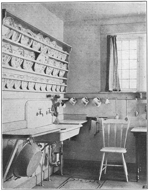Any kitchen can have a chair-rail put around it, and this four-inch wide board should be arranged with small hooks placed at a distance of ten or twelve inches apart, and on these should hang the enamelled spoons, strainers, egg-beater, small jugs, and the saucepans, the bottoms of these being always in evidence and not out of sight in cupboards. The Europeans have always had their cooking [30]utensils displayed as a part of the kitchen furnishing, and when this is done there is less temptation to neglect their absolute cleanliness.