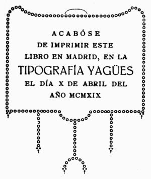 ACABÓSE DE IMPRIMIR ESTE LIBRO EN MADRID, EN LA TIPOGRAFÍA YAGÜES EL DÍA X DE ABRIL DEL AÑO MCMXIX