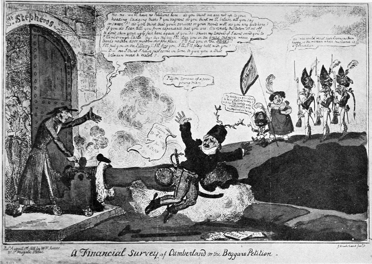 “A Financial Survey of Cumberland or the Beggar’s Petition.” (From the only known uncoloured impression of the plate) ▶ … Between pages 64 and 65