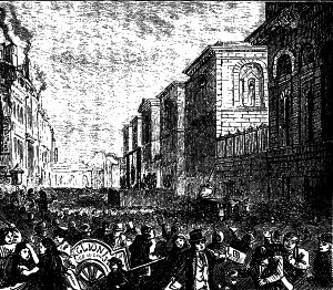 The first number of the London Times was printed January 1, 1788, by John Walter, and the first newspaper printed by steam in Europe was the Times of November 29, 1814. Applegarth and Cowper's four cylindered presses, printing five to eight thousand sheets an hour, were in use by the Times for many years. These were succeeded by Hoe's press with Whithworth's improvement, and now the Bullock press modified, which prints on an endless sheet, is used by the Times. The circulation of this, the leading journal of Europe, varies from 57,000 to 65,000 copies a day, and the owner is Mr. Walter, the son of its founder. John Thaddeus Delane, the son of William F.A. Delane, the former financial manager, who has been succeeded by Mowbray Morris, is the editor of the Times. He is an Oxford man, and was admitted to the bar in 1847. Since 1839 he has been connected with the Times, to whose editorship he succeeded in 1841, on the decease of its then famous editor, Mr. Thomas Barnes. The value of the Times newspaper property has been estimated at three million pounds, or fifteen million dollars. As Thackeray said, its ambassadors are everywhere; one may be seen pricing potatoes at Covent Garden, while another is committing to paper the Cabinet intrigues at Berlin. Among its most celebrated writers have been Barnes, Sterling, Horace Twiss, William Howard Russell, Thackeray, Thomas Noon Talfourd, Baron Alderson, Louis J. Jennings, the American correspondent, now editor of the New York Times, and others. Southey was offered the editorial management at a salary of £2,000 a year, and the same offer was made to Thomas Moore, the poet, but both declined acceptance. The Times, with supplement, has seventy-two columns of matter, on sixteen pages, and 2,250 advertisements have been inserted in one day's issue, seven tons of paper, with a surface of thirty acres, and seven tons of type, being used.