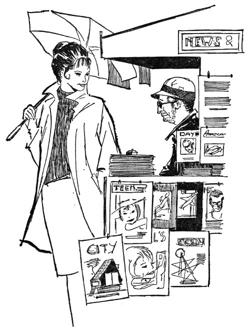 Outside her window, the city took the news of Peggy’s intended conquest calmly. Somewhere a lone taxicab gave a derisive toot on its horn as it squealed to a stop to pick up a fare. Peggy mentally stuck out her tongue at the driver and settled back to make plans for tomorrow. But before she could get really comfortable, an enthusiastic spatter of applause came from the doorway.