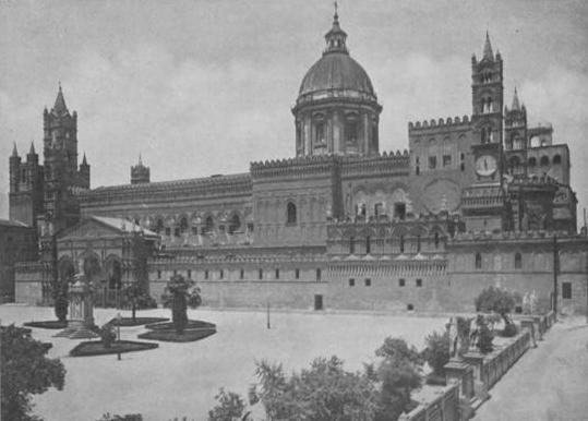 279It is Jane’s and Peripatetica’s last day in Sicily. Gaspero has taken them to Santa Maria di Gesu, the Minorite Monastery, but has paused by the way for a look at San Giovanni degli Eremiti, whose little red domes float clear against the burning azure sky like coral-tinted bubbles, so airily do they rise from the green of the high hill-garden with its tiny cloisters of miniature columns and miniscule grey arches heavy with yellow roses. And yet from this rosy, arch little fane rang the Sicilian Vespers which gave the signal for one of the bloodiest butcheries in history. It was Pasqua Flora, and all Palermo, as it did yesterday, was feasting and dancing out of doors. One of the French soldiers—then in occupation, upholding the hated House of Anjou—insulted a Sicilian girl and was stabbed. Just then the Vesper bells rang from San Giovanni degli Eremiti, and at the signal the conspiracy, long festering, broke into open flame, and Palermo rose and massacred the French till the streets ran with blood.