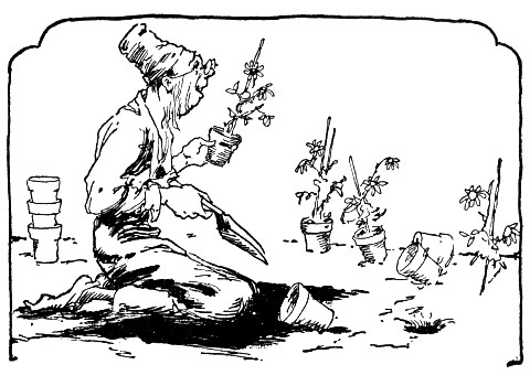 "So there you are!" Pinny Penny straightened up with a little grimace, for he had been planting flowers in a new rock garden he was planning for the King. With an expression about equally compounded of exasperation and affection, he looked at his former Master and the white horse who had, without sound or warning, dropped down in the path before him. "I thought you'd come back," continued Pinny Penny, calmly rubbing the mud from his fingers and putting out his hand. "So it was your horse, after all." His gaze rested speculatively on the splendid white steed and richly jeweled robes of Skamperoo. "And you've made your fortune, I see! Well, welcome home anyway, your crown's hanging on a nail back of the throne and I think you will find everything in order."