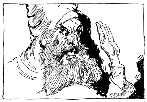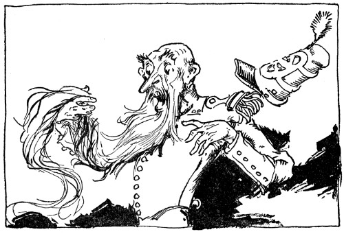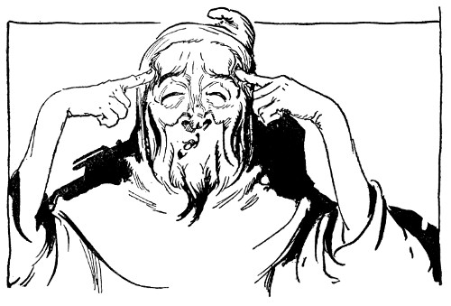 "Wait, I'll tell you!" Closing his eyes, the sage went hurriedly on with the story. "Ah, so this is it! A woodcutter's boy, poking about among the leaves, found the emeralds and as emeralds in themselves are not uncommon in Oz, he traded them to a peddler for a new ax. The peddler, arriving after a long while in Skampavia, had no trouble in disposing of the jewels. In Skampavia, you must know, emeralds, pearls, or jewels of any kind are practically unknown, and a merchant gave the peddler not only his house and shop, but all of his merchandise for the three sparkling chains. By a law in Skampavia every subject must render to the King one-third of all he owns or raises, and in due course, one of the necklaces was sent to Skamperoo. The King, delighted with the sparkling gems, insisted on having all three necklaces, and Matiah himself brought them to the castle, determined, if possible, to steal them back at the first opportunity. In order to do so without arousing the suspicions of the King, he pretends to be a Wizard and tells him if he, Matiah, wears the three necklaces, he can grant any wish the King may make, but that as he makes the wish he must close his eyes and count to a hundred. As soon as Skamperoo began to count, Matiah started to run off with the emeralds and that accounts for the white horse, for you see Skamperoo's first wish was for a splendid white charger with a golden mane and tail. Frightened almost out of his senses by the sudden appearance of the horse and the knowledge that the chains really did have some magic power, Matiah steals back beside the King, resolved to wait for another opportunity to procure the necklaces. Meanwhile, Skamperoo, excited and happy over the granting of his first wish, confides in the merchant his second wish and ambition to be ruler of Oz. Matiah, to gain time in which he can work out the secret of the emeralds' power, approves of the King's idea, but tells him he can only grant one wish a week. He then advises Skamperoo to cause all the people in Oz to forget their former rulers and to remove the Wizard and all his magic, Ozma, and the rulers of the four Oz countries to the inaccessible caverns of Thunder Mountain.