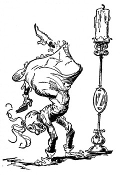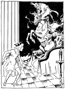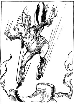 So, having exhausted all the possibilities in the immediate neighborhood, Skamperoo tapped his foot in vexation and began casting about in his mind for some fair and faraway country to conquer. He closed his eyes in order to think better and was just on the point of falling into a pleasant doze of riches and conquest, when Pinny Penny came noisily into the room.