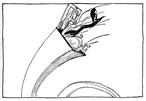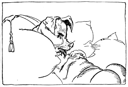 "What's all that racket?" demanded his Master, as a medley of shouts, roars, and dull thuds came rolling up to them. Forgetting his anger for a moment, he bounded to his feet and came across the room to look over Pinny Penny's shoulder.