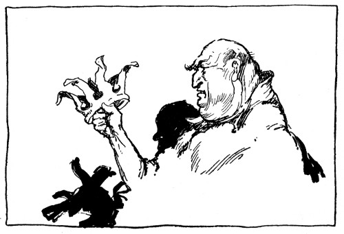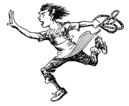"Well, don't blame me if we're turned to pretzels and pumpernickel," grunted the pig, dropping the necklaces into the seer's outstretched hand. "Goodbye, all." Turning his back in disgust and covering his ears with his wings, Pigasus waited in fear and trembling for the end. But Bitty Bit quite calmly handed the emeralds to Skamperoo, and Skamperoo immediately draped them over Chalk's left ear.