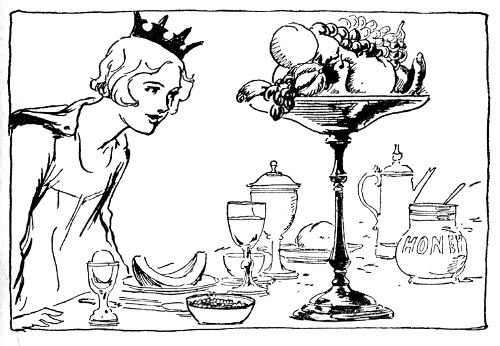"Now what did he mean by that?" muttered Skamperoo peevishly as his little Prime Minister whisked out of sight. Pursing his lips, he seated himself heavily on his throne. After all, Pinny Penny had only spoken the truth. Why had his father or his father's father ever picked out this pesky little country in the first place? Located in the southern part of the desert of Noland, between the Kingdoms of Ix and Merryland, Skampavia, he was forced to admit, had neither riches, beauty, nor interest. His castle, though poor and shabby, was comfortable enough, and having lived in it all his life, he was used to it. He had put up with the hot dry climate and the poor quality of the food, but after all, why should he continue to do so? In those long ago days in the school room he had studied of energetic rulers who had taken their armies and gone forth to conquer richer and more desirable lands from their neighbors. Well, then, why should not he take his men, push over the border into a more fertile and kindly land? The idea pleased but at the same time annoyed him. Skamperoo was fat and lazy. He loved quiet and ease and the thought of a hard military campaign made him shudder with distaste. Still, he reflected, remembering Pinny Penny's reproachful face, a King should do something for his subjects and the more he did for them—Ho, ho! the more he could make them do for him. A rich and prosperous country meant a rich and prosperous ruler. Discontentedly fingering the rough cloth from which his royal robes were fashioned, he began to picture himself decked out in splendid satins and velvets heavily encrusted with jewels. Jewels. Pah! All the jewels he had were his plain gold scepter, badly dented and bent from hurling at Pinny Penny. Taking off the crown, he scowled at it critically and began considering the realms on either side of his own dominions.