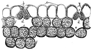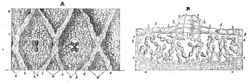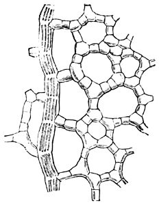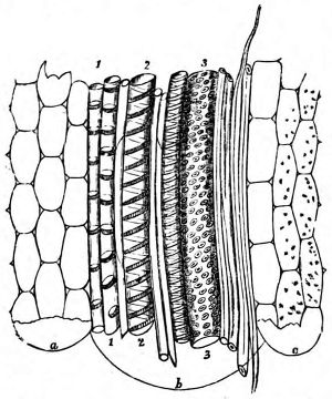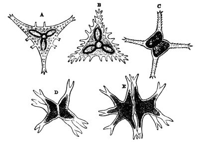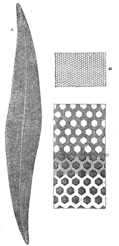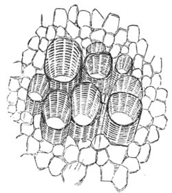 Octahedral, prismatic, and stellar microscopic crystals formed by the chemical combination of the natural acids with bases imbibed by the roots, are deposited in the cells under the skin, and in all parts of plants. However, they appear most frequently as bundles of needle-shaped crystals of carbonate of lime, lying side by side in the hollow of a cell. They are known as raphides, from raphis a needle, and may be easily seen under the skin of the medicinal squill. Large single crystals of oxalate of lime, octahedral or prismatic, are found in the cells under the skin of the onion and other plants; and stellar 425crystals of the same substance abound so much in the common rhubarb that the best specimens of the dry medicinal root contain as much as thirty-five per cent. of them; while certain aged plants of the cactus tribe have their tissues so loaded with them as to become quite brittle. The calcareous base in some instances is combined with tartaric, citric, or malic acid. The crystals of some raphides are 1⁄40th of an inch long, others are not more than the hundredth; they are brought into view by polarized light.[80] Spherical raphides between the 1⁄2000th and 1⁄4000th of an inch in diameter have been discovered scattered profusely through the tissues of the leaves, and those parts of plants which are modifications of the leaves; they may be seen under the skin of Pelargoniums and other plants, and it is supposed that few if any orders of plants are without them.[81]