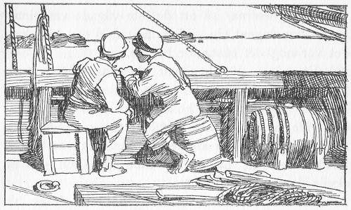 »Ja, håll på med det. I dag ä’ det jag, som ä’ lite döv. Han ids inte lägga till vid bryggan — stryker bara tätt förbi, slag efter slag, och vill, att jag, ofärdiga stackare, ska’ hoppa ombord. Ja, nog seglar han bra, förstås. Men du ska’ visa honom en gång, Gobort, hur det går till att kasta öskaret i sjön och sedan segla in’et över suden.»[2]