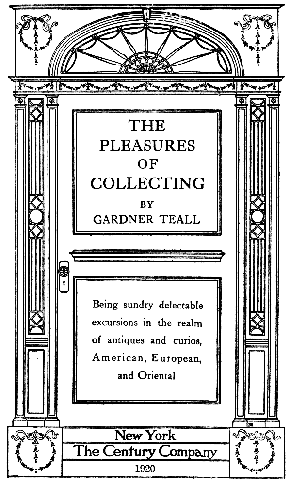 In “Le Jardin d’Epicure,” Anatole France has written: “People laugh at collectors, who perhaps{2} do lay themselves open to raillery, but that is also the case with all of us when in love with anything at all. We ought rather to envy collectors, for they brighten their days with a long and peaceable joy. Perhaps what they do a little resembles the task of the children who spade up heaps of sand at the edge of the sea, laboring in vain, for all they have built will soon be overthrown, and that, no doubt, is true of collections of books and pictures also. But we need not blame the collectors for it; the fault lies in the vicissitudes of existence and the brevity of life. The sea carries off the heaps of sand, and auctioneers disperse the collections; and yet there are no better pleasures than the building of heaps of sand at ten years old, of collections at sixty. Nothing of all we erect will remain, in the end; and a love for collecting is no more vain and useless than other passions are.” Anatole France might well have added Sir James Yoxall’s observation, that “good for health of mind and body it is to walk and wander in by-ways of town and country, searching out things beautiful and old and rare with which to adorn one’s home.” Indeed, collecting has aspects other than the one of discovery, of acquisition, of entertainment, or of furnishing a pastime: it has its utilitarian one as well.{3}