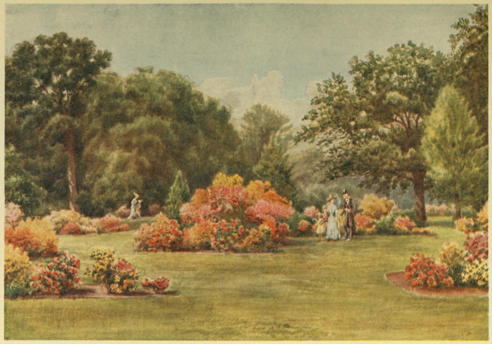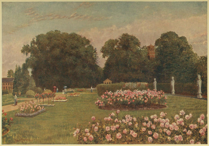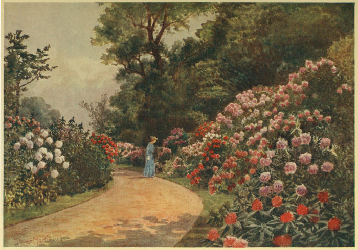 The Botanic Garden near Rio de Janeiro, also, has tropical features we can hardly match, such as its colonnade of palms, a living temple overtopping the suburban avenues in which tram lines have been planted by foreign capital. Then the Gardens of Peradenia in Ceylon gather such a bouquet of choice flora as an enraptured traveller compares to “the paradise of some Eastern tale, designed and inhabited by invisible genii.” Our Australian colonies, so well off for sun, if not for water, are undertaking to show the Old Country what can be done in this way by children freed from some of her disadvantages. Sydney, besides its rich Botanic Gardens, can afford to keep stretches of wild scenery preserved in all their unkempt luxuriance; and behind Melbourne Nature itself has a giant grove of gum-trees, rising from the undergrowth of ferns that with us would rank as tall trees. And, of course, in many other parts of the world, comparatively[165] little expense can bring together a collection of our rare and delicate blooms, there ranking as weeds.