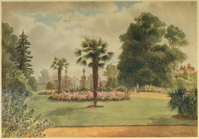 Kew has grown out to run into Richmond by blocks of commonplace suburban houses, some of which boast to stand on a dozen feet of gravel. The quaint Georgian mansions have mostly sunk in relative importance; and the homely cottages that once neighboured them have gone, or are like to go, though some of them still do a trade in refreshments, notably in sixpenny and ninepenny teas served to holiday parties. One side of the Green, turning from the Bridge to the main gate, is a row of houses and gardens of entertainment, at the doors of which, on a Sunday afternoon, clamorous touts strive to draw in the coming and going streams of sightseers, thus admitted to dwellings where celebrities of the past may once have been at home. This is a sign how as Kew waned in[158] aristocratic favour, it waxed as a scene of popular resort, through the attractions of its oasis in Greater London’s desert of brick and mortar.
