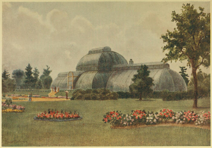 Kew Gardens contain what seems the completest botanical collection in the world, handicapped as it is by a climate at the antipodes of Eden, and by a soil that owes less to Nature than to patient art. Before being given up to public pleasure and instruction, this demesne was a royal country seat, specially favoured by George III. That homely King had two houses here and began to build a more pretentious palace, a design cut short by his infirmities, but for which Kew might have usurped the place of Windsor. For nearly a century it kept a close connection with the Royal Family, as the author illustrates in his story of the village and the Gardens, while the artist has found most effective subjects in the rich vegetation gathered into this enclosure and in the relics of its former state.