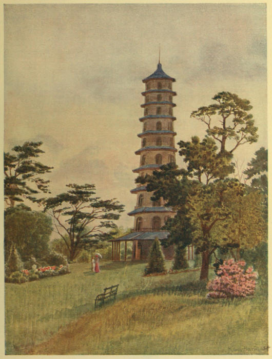The most conspicuous feature of Kew is its Pagoda, from many points seen towering over the well-wooded flat watered by a winding reach of the Thames. Such an outlandish structure bears up the odd name in giving a suggestion of China, not contradicted by the elaborate cultivation around, where all seems market-garden that is not park, buildings, groves or flower-beds. Yet the name, of old written as Kaihough, Kaiho, Kayhoo, and in other quaint forms—for which quay of the howe or hough has been guessed as original—belongs to a thoroughly English parish, whose exotic vegetation, nursed upon a poor soil, came to be twined among many national memories. These, indeed, are most closely packed about what may be called[2] the willow-plate pattern period of our history, when a true-blue conservatism had the affectation of letting itself be spangled with foreign amenities and curiosities, jumbled together without much regard for perspective or natural surroundings.