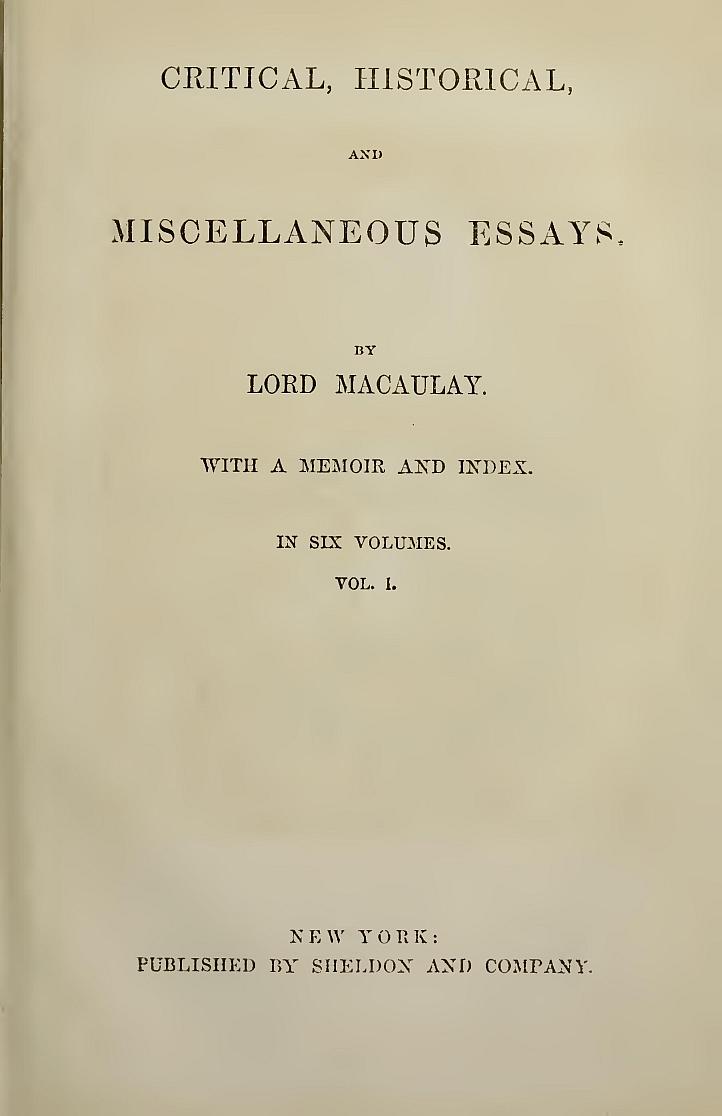 This edition of Lord Macaulay’s Critical, Historical, and Miscellaneous Essays, contains all the articles published with the author’s correction and revision (3 vols., London: Longman, Green, & Co.) during his lifetime, and all the articles published by his friends (2 vols., London: Longman, Green & Co.) since his death. An Appendix contains several essays attributed to Lord Macaulay, and unquestionably his, not found in any other edition of his miscellaneous writings.