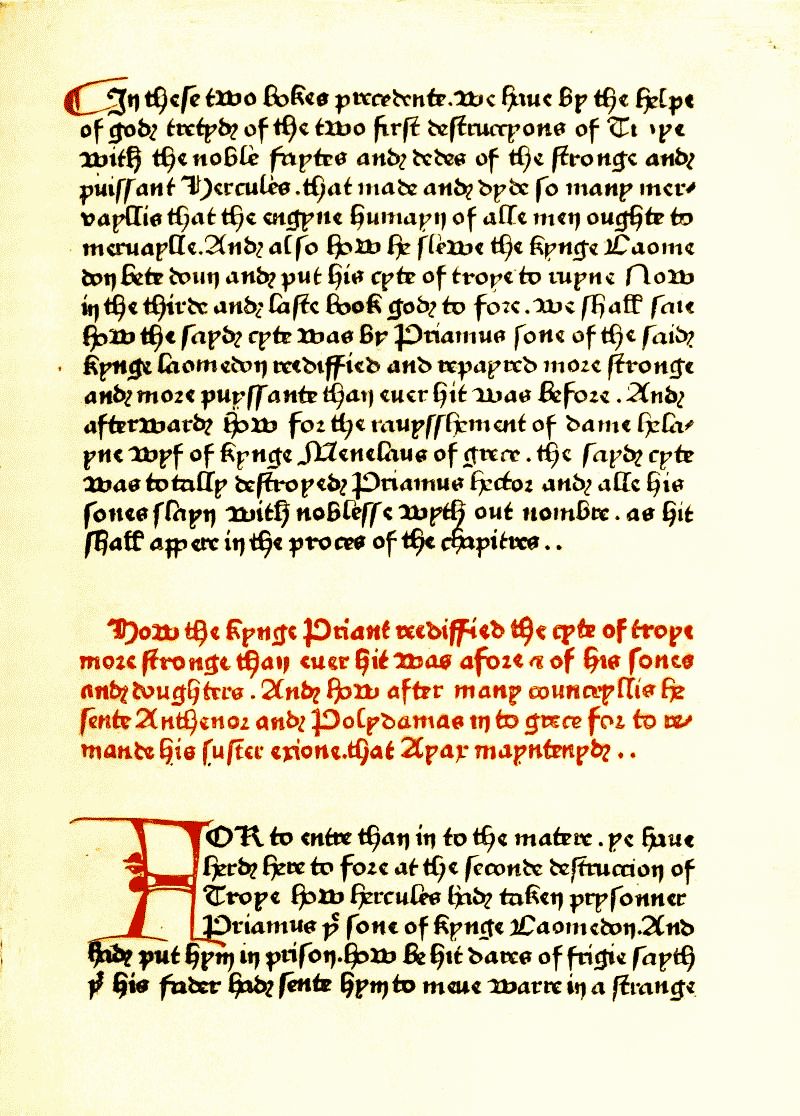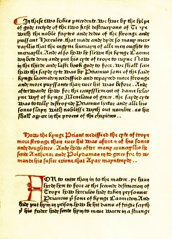 | II. | The Recuyell of the Historyes of Troye Printed in Caxton's Type 1. Leaf 253, the first of the third book. [From the copy in the Bodleian Library, Oxford.] |