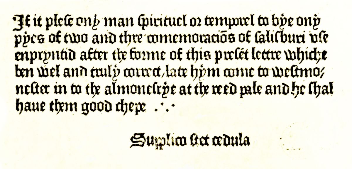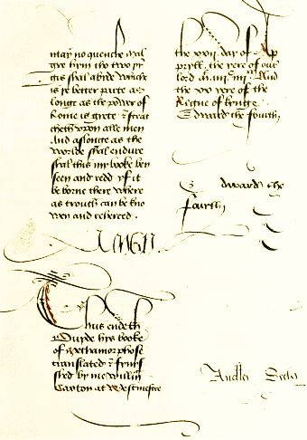 "Of your charitee pray for the soul of Mayster Wyllyam Caxton, that in hys time was a man of moche ornate and moche renommed wysdome and connyng, and decessed ful crystenly the yere of our Lord M.CCCC.Lxxxxj.
