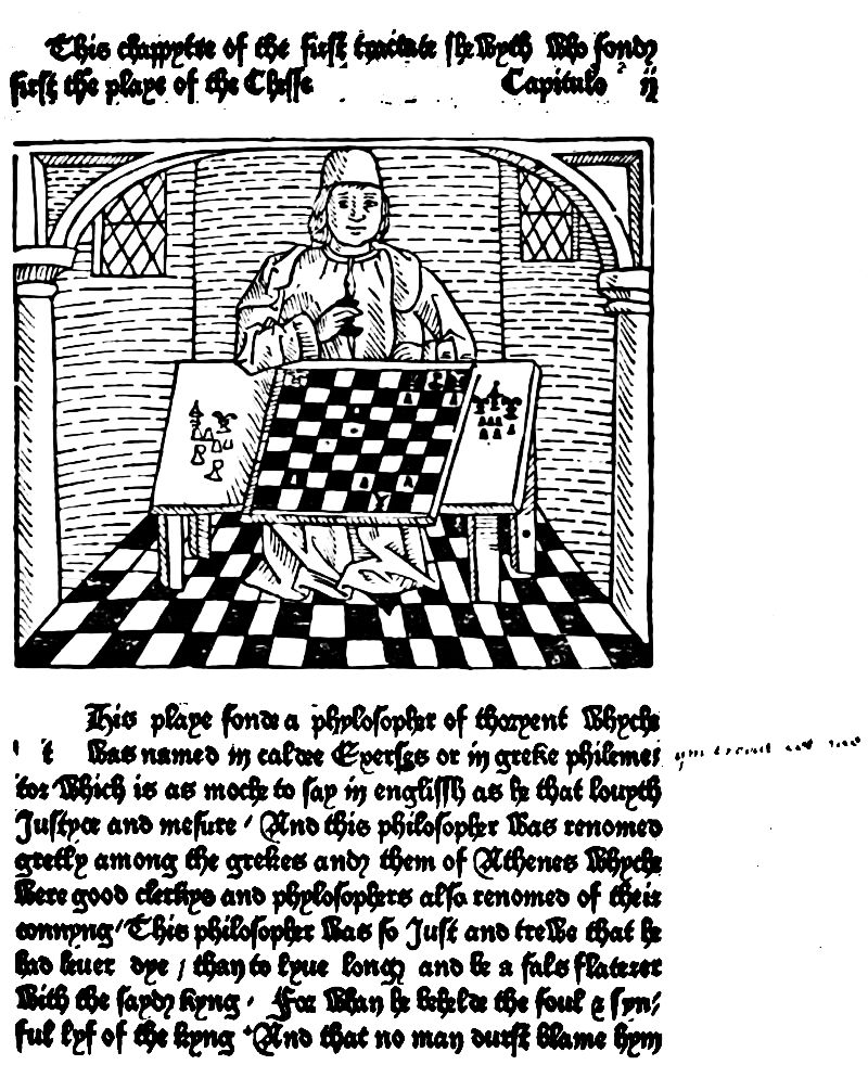 | VIII. | The Game and Playe of the Chesse Printed in Caxton's Type 2*. The wood-cut represents the philosopher who invented the game. [From the copy in the Bodleian Library, Oxford.] |
