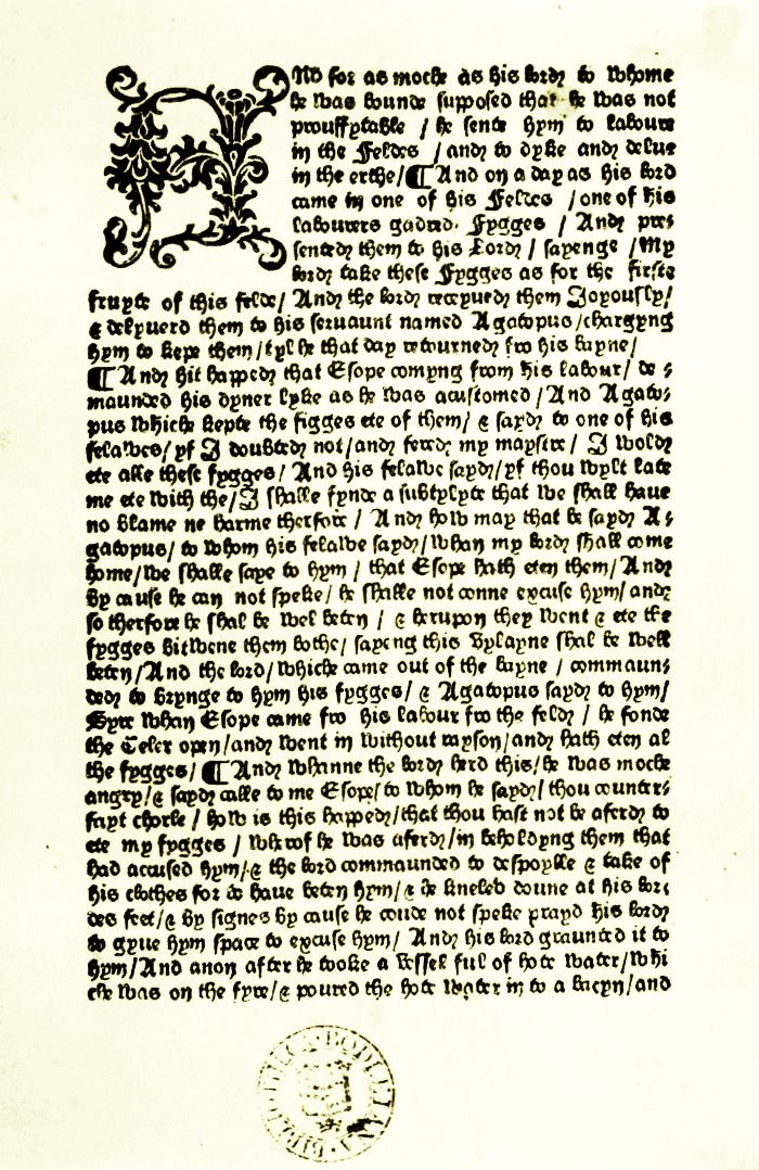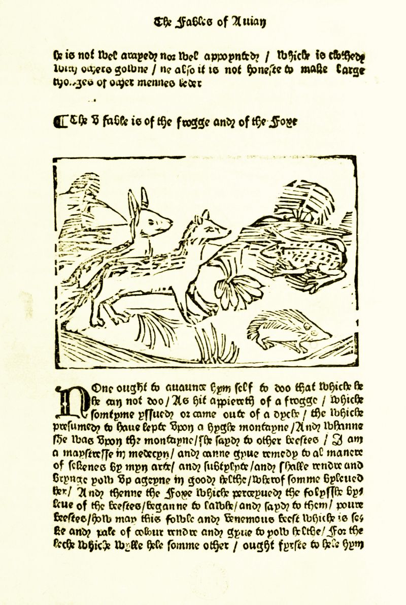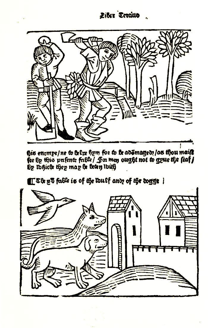 | XII. | The Fables of Esope The wood-cut here shewn is engraved in an entirely different manner from the rest. [From the copy in the Bodleian Library, Oxford.] |