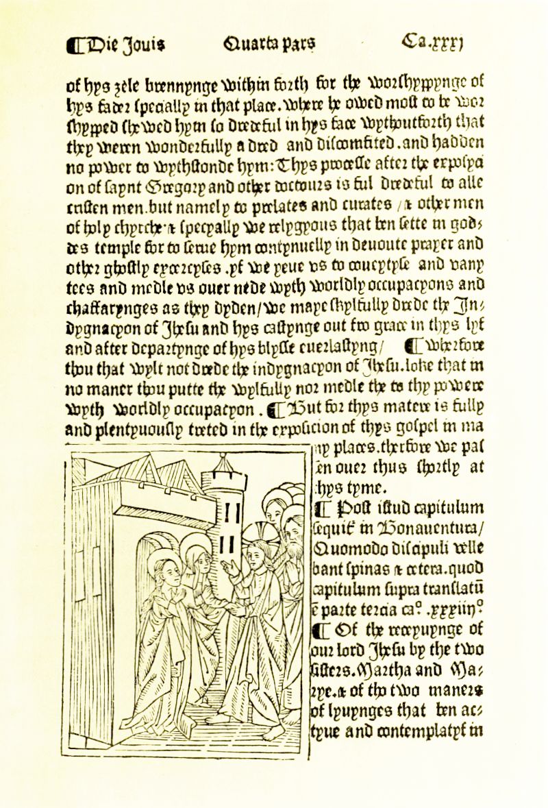 | XV. | Speculum Vitæ Christi Printed in Caxton's Type 5. The wood-cut depicts the visit of Christ to Mary and Martha. [From the copy in the Bodleian Library, Oxford.] |