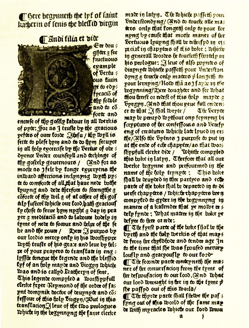 The first of these books is a small folio of 96 leaves, and contains, besides the Life of St. Katherine of Siena, the Revelations of St. Elizabeth of Hungary. The type used is a modification of Caxton's type No. 4*, recast on a slightly smaller body and with several new additions. Unlike Caxton's books which were made up in quires of eight leaves, this has been made up in quires of six. Another point which distinguishes it and the remaining books from Caxton's work is the introduction of several remarkable capital letters. These were obtained along with a fount of type and some wood-cuts from Godfried van Os, apparently about the year 1490, when he moved from Gouda to Copenhagen. The fount of type was not used until 1496, and then only for one book.