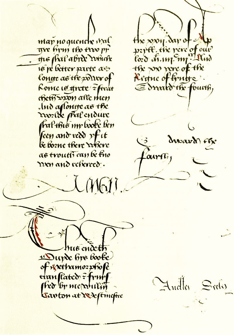 These, like all Caxton's translations, were done for the press, so there is every reason for believing that the Ovid also was printed. Fortunately we have further evidence, for in the Pepysian collection at Magdalene College, Cambridge, is a manuscript on paper bought by Pepys at an anonymous auction, which contains the last six books of the Metamorphoses, with the following colophon: "Translated and fynysshed by me William Caxton at Westmestre the xxij day of Apryll, the yere of our lord. M. iiijc iiijxx. And the xx yere of the Regne of kyng Edward the fourth."