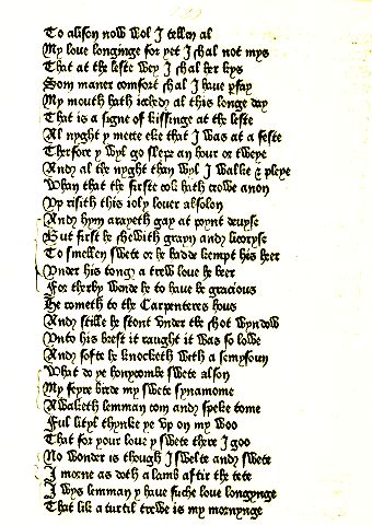 Of the Book of Courtesy, which, like the earlier editions, was in quarto, nothing now remains but two leaves printed on one side in the Douce collection at the Bodleian. These two leaves, which have been used at some time to line a binding, are waste proof of the beginning and end of the second and last quire of the book, which probably consisted, like the earlier edition, of 14 leaves. On the last page, under the colophon, "Here endeth a lytyll treatyse called the booke of curtesye or lytyll John. Enprynted atte westmoster," is De Worde's device printed upside down, the reason no doubt for the rejection of the sheet.