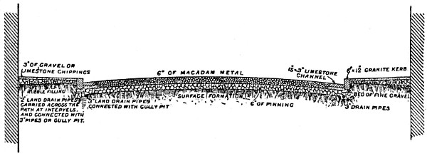 Foundation — List of materials for footpaths — Mastic asphalte — Description of manner of laying — Proportions of asphalte, bitumen, and grit — Yorkshire flagging — Specification for York flagging — Caithness flagging — Its advantages — Blue lias flagging — Concrete footpaths — Description of American concrete path — Artificial stone pavements — Brick footpaths — Granite slabs — Artificial asphalte paths — Specification of tar pavement — American tar pavement — Gravel footpaths — Sections of paths — Tarred paths106
