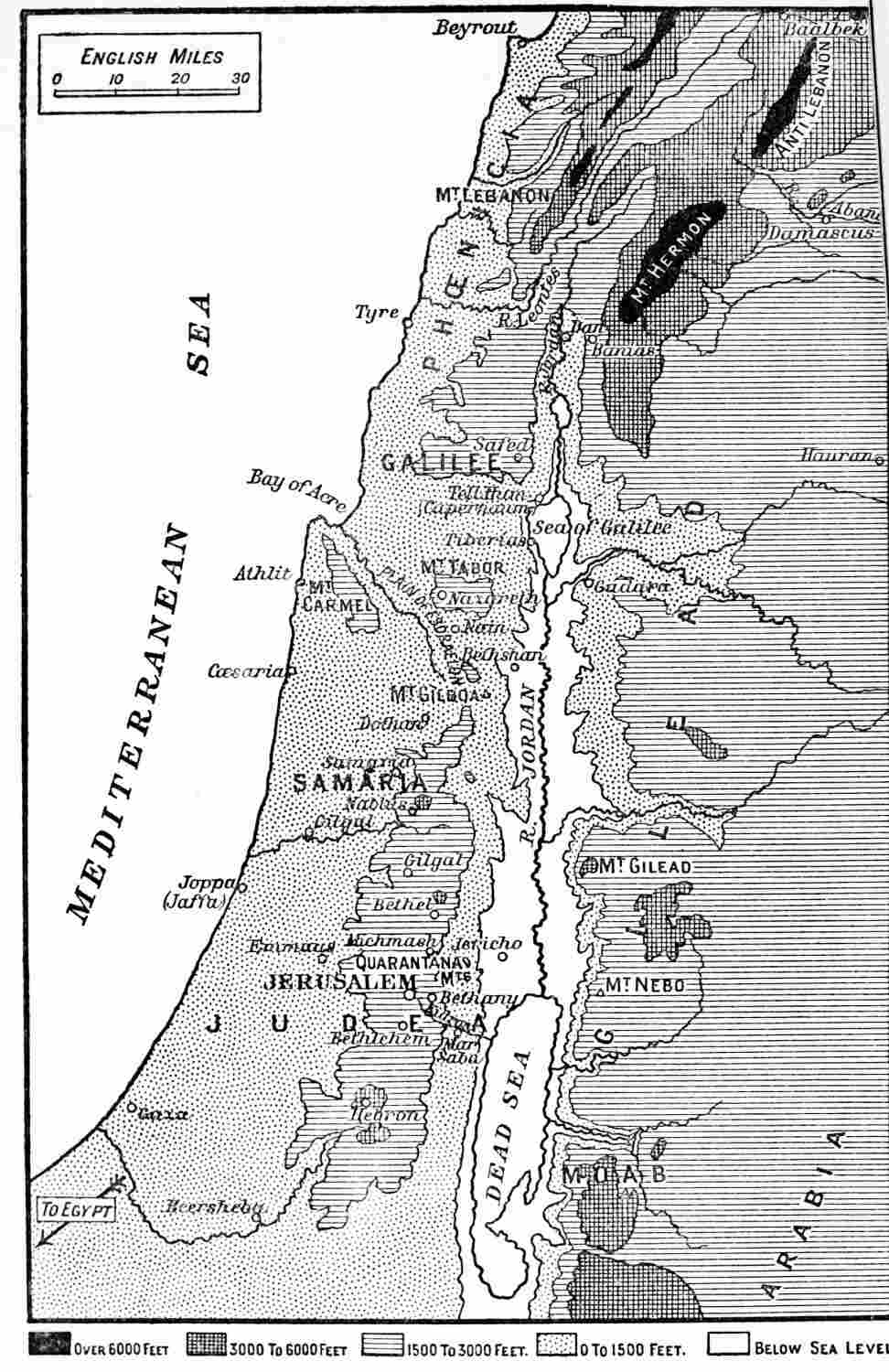 Every writer about Palestine speaks of the smallness and concentration of the land, yet these take the best informed by surprise. It is “the least of all lands” indeed, when one thinks how much has happened in it. Leaving Jaffa at 10 A.M., the steamer reaches Beyrout at 6 P.M. The passengers in that short sail have seen the whole of Palestine. National life there is a miniature rather than a picture. In a stretch of country equal to that between Aberdeen and Dundee you cover the whole central ground of the Bible, from the Sea of Galilee to Jerusalem. In a ride equal to the distance from London to Windsor there may be seen enough to interpret many centuries of the world’s supreme history. The Dead Sea is but 50 miles from the Mediterranean, the Sea of Galilee about 25 miles; while the distance in miles between the two seas is only 55. Yet in that little land there is every kind of soil, from mere sand and broken limestone to rich red and chocolate loam. It is a mountainous country throughout, and its inhabitants{38} are a race of Highlanders. So numerous are its mountain spurs that you may pass up and down the centre of the country for scores of miles, and yet never catch sight of the sea, though you constantly feel it in the breeze. Everything is there—the gorge, the wide sweeping valley, the great plain, the rolling tableland. It is, indeed, a land in miniature, the multum in parvo of lands. Its history and religion, like its natural features, are crushed together and compact. The epigram is the only form of speech that can express it.